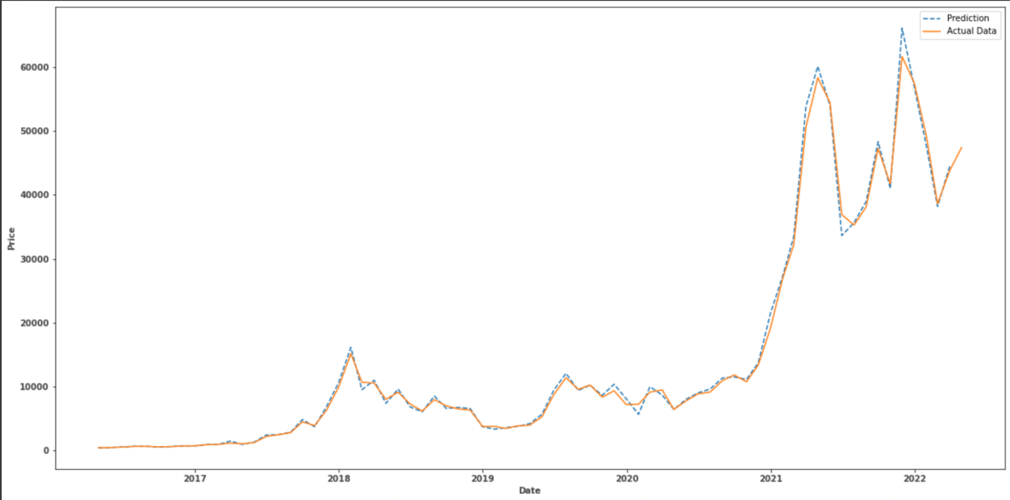The graph below shows how closely the predicted prices mirror the actual prices. This model offers a good prediction accuracy and to be relatively fast compared to other alternatives, in terms of training/fitting time and complexity.